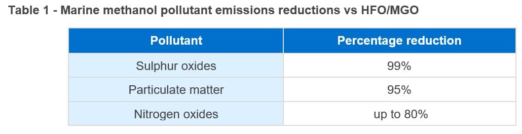 IMO 2020 set a new precedent for the sulphur content of bunker fuels, targeting conventional marine fuels such as heavy fuel oil (HFO) and marine gas oil (MGO). Table 1 shows that methanol is a viable alternative, as it dramatically lowers the production of harmful emissions, given that its combustion generates no sulphur oxides (SOx) or particulate matter (PM). Ships powered by methanol comply with the strictest emissions regulations, eliminating the need for exhaust gas after-treatment, and meeting IMO Tier III nitrogen oxides (NOx) emissions standards. Moreover, the use of methanol can reduce in-sector CO2 emissions by up to 72% compared to high sulphur fuel oil (HSFO).