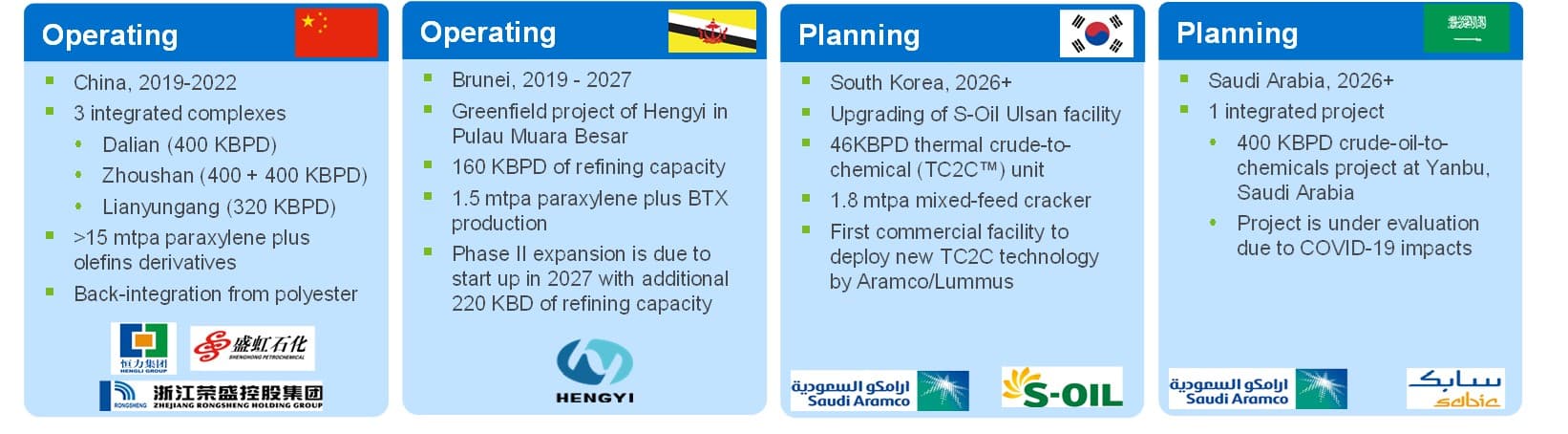 In Brunei, Zhejiang Hengyi Group and the national Government’s Damai Holding has developed 160KBPD Hengyi Pulau Muara Besar (PMB) utilizing domestic crude oil to drive petrochemical exports to China. Phase II is due to start up in 2027 with approximately US$ 9 billion of investment.