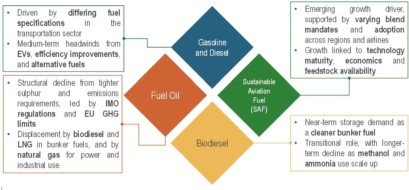 Product-level storage demand is increasingly shaped by decarbonisation policies across transportation, shipping, and aviation sectors. Figure 1 below presents a product level overview of storage demand trends, highlighting potential changes in consumption and corresponding storage requirements for selected products over time, including gasoline, diesel, fuel oil, SAF and biodiesel.