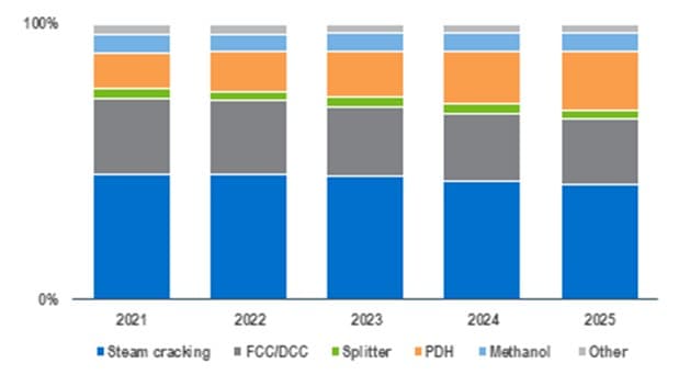 Historically, the conventional routes to propylene production were as a byproduct of olefins production such as steam cracking, or recovery from refinery processes like fluid catalytic cracking. More recently, methanol-based propylene has become prevalent, but with the advent of the shale gas revolution in the United States, steam cracking focused more on lighter feedstocks, reducing propylene byproduct production. Furthermore, investments in ethane and NGL export capacity from the United States contributed to the conversion to lighter steam cracker feedstocks in other parts of the world, creating an imbalance in the conventional supply of propylene and leading to the growth in on-purpose propylene processes such as propane dehydrogenation.
